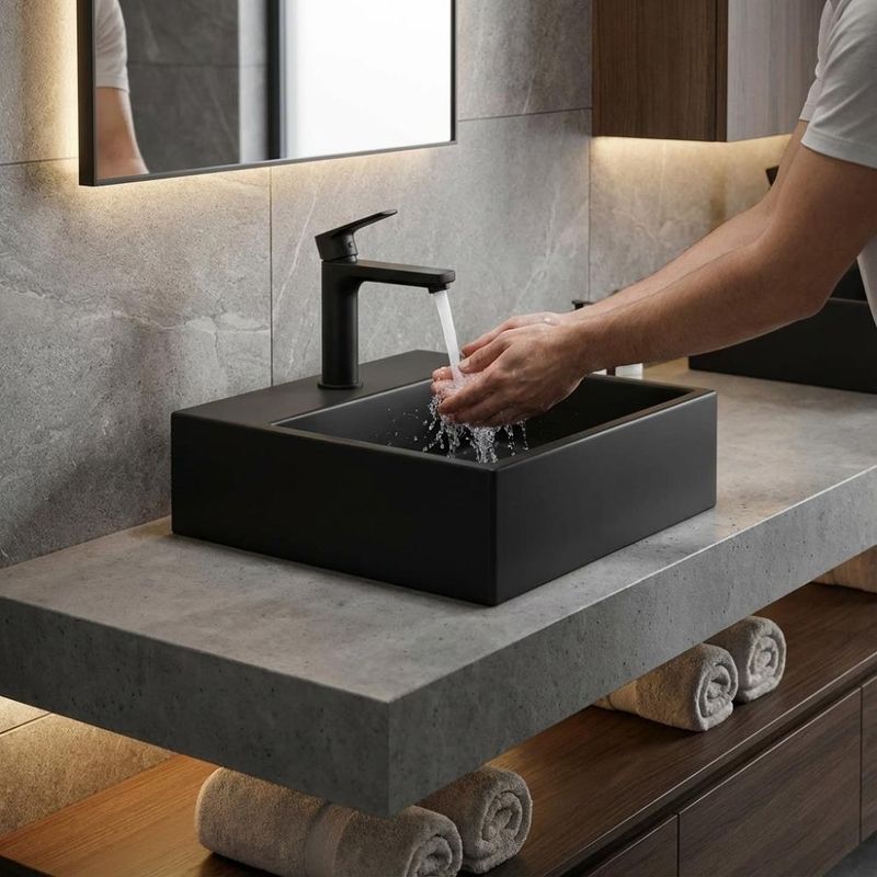 Para que serve a Cuba Apoio Quadrada 35cm Basic Q6 Preto? Esta cuba é ideal para banheiros e lavabos que buscam elegância e funcionalidade. Sendo uma cuba de apoio, ela é instalada sobre a bancada ou móvel, não ocupando espaço interno do gabinete, permitindo maior flexibilidade no design do ambiente. É compatível com torneiras monocomando ou misturadores de bica alta, oferecendo praticidade e sofisticação ao espaço. A peça fica totalmente aparente na bancada, funcionando como elemento decorativo e funcional.