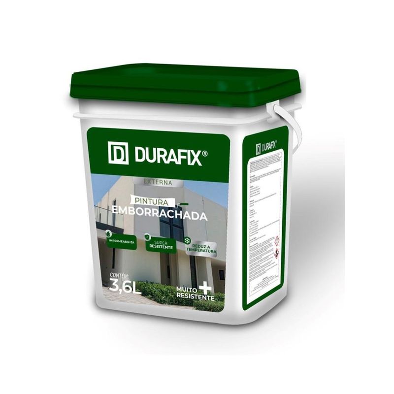 O que é a Tinta Emborrachada Branco Neve 3,6L? A Tinta Emborrachada Branco Neve 3,6L DURAFIX é uma tinta acrílica de alta performance desenvolvida com tecnologia avançada para proteção de superfícies externas. Formulada com resinas acrílicas com características elásticas, proporciona acabamento flexível e fosco que impermeabiliza e protege contra umidade, chuva e desgaste. Sua película elástica acompanha os movimentos de dilatação e contração das superfícies sem danos.
